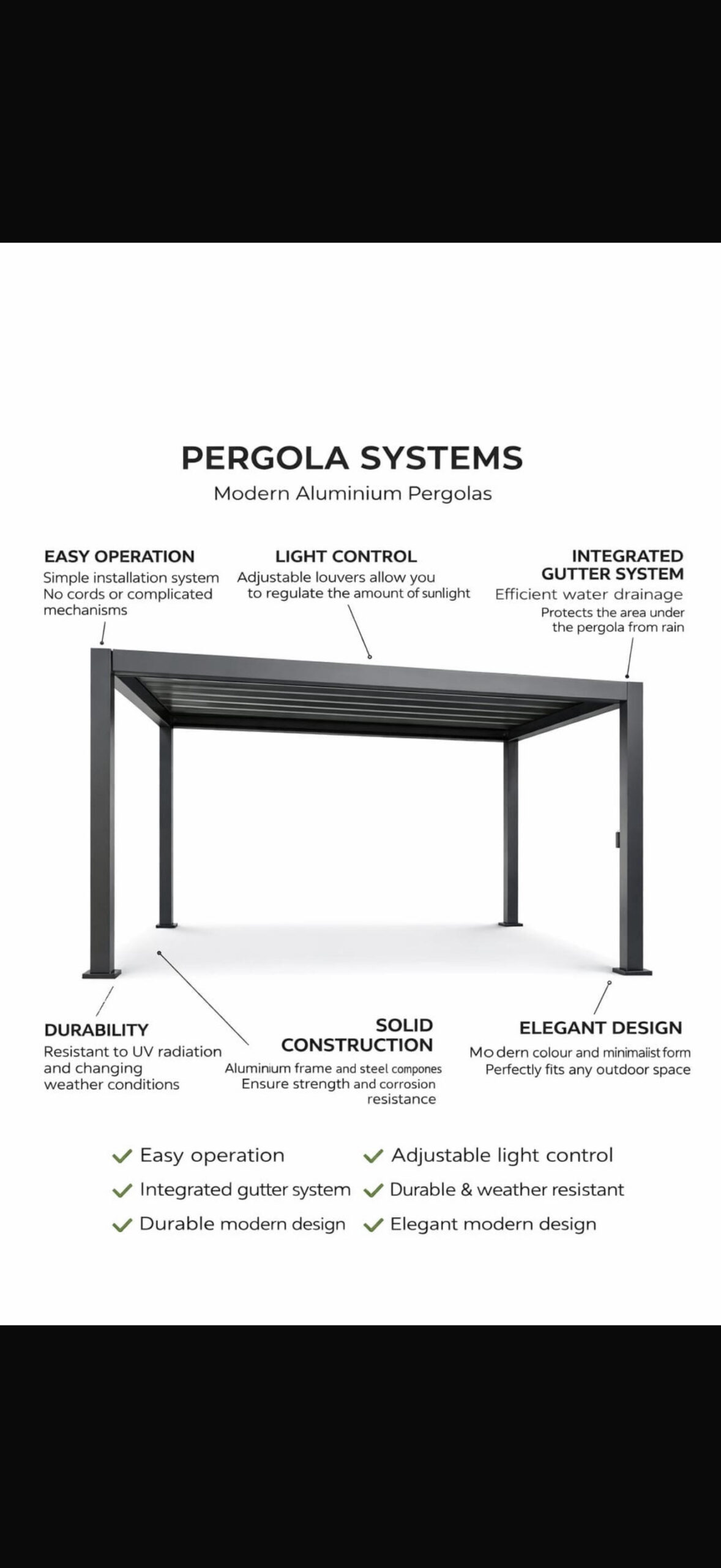 The Gutroof Premium Garden Pergola delivers sophisticated style combined with superior functionality, transforming your garden or terrace into a comfortable year-round outdoor retreat. Constructed from high-quality aluminium with adjustable steel louvers, this pergola offers complete control over sunlight, shade and ventilation to suit your exact requirements.